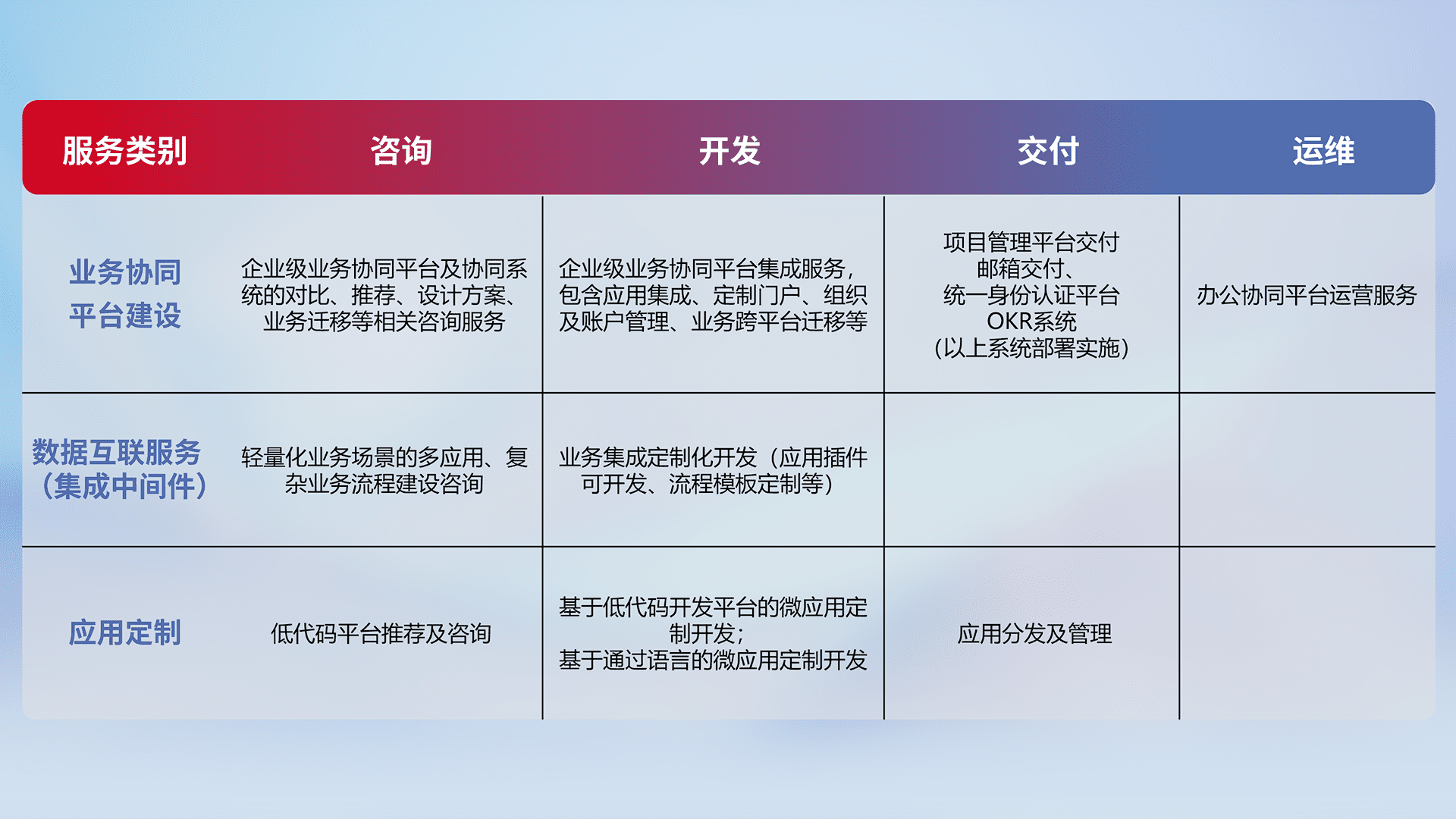 针对钉钉、、、企微、、IDaas等平台级产品提供产品的规划、、、、方案、、、、交付、、、定制化开发等服务,,,实现如统一协同办公、、、智能客户服务、、、、混合会议管理、、、、智能数据查询、、、等业务场景,,实现数字化转型。。。。