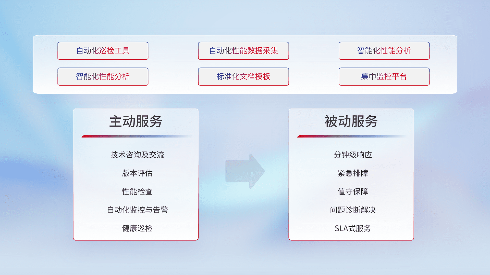 智能化工具和标准化文档,,保障服务质量,,,,提供主动服务(包含技术咨询、、版本评估、、、性能检查、、、、自动化监控与告警、、健康巡检)和被动服务包含(分钟级响应、、、紧急排障、、值守保障、、、问题诊断解决、、、、SLA服务)。。